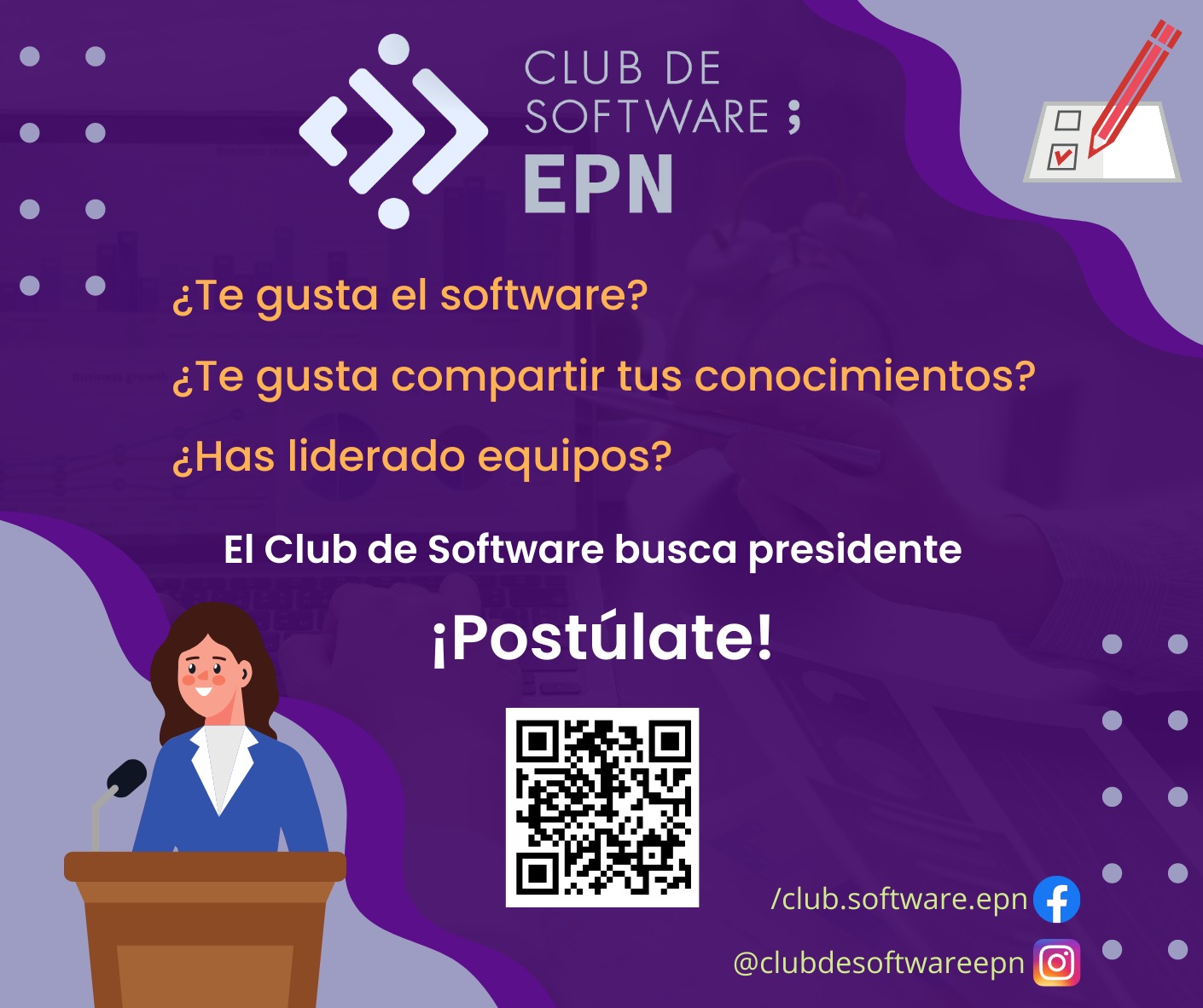 El Club de Software EPN está buscando a los líderes del futuro. Únete a la directiva y ayuda a moldear el rumbo de nuestro club. Si eres apasionado por la tecnología y quieres hacer la diferencia, ¡postúlate ahora!